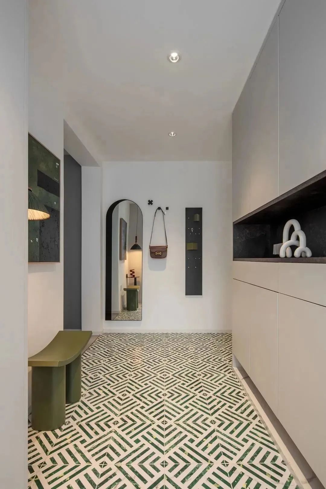 顶天立地的鞋柜,中间做了隔断,现代风装饰品的加入让空间更雅致,放置艺术感换鞋凳,让屋主出门回家时可以坐下来从容的换鞋。