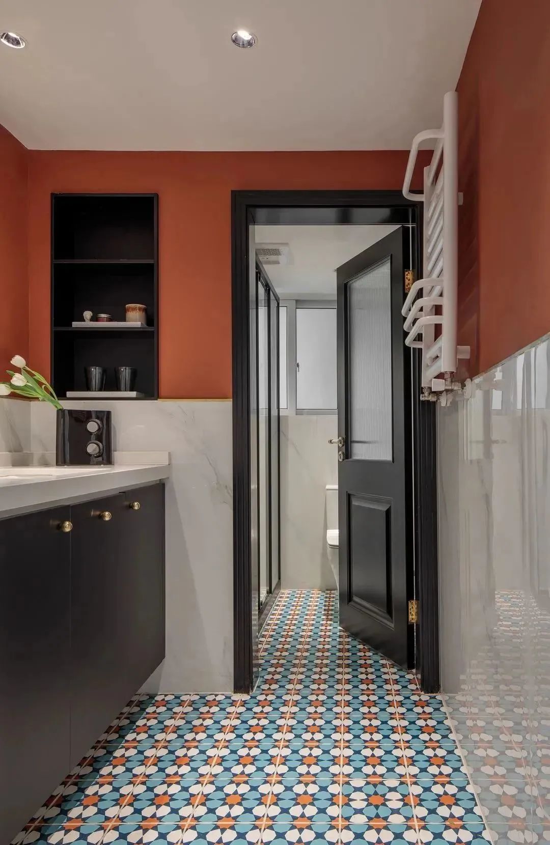 橙色卫生间墙砖,使空间更加明亮,下方搭配浅色瓷砖,让空间多了一些时尚感,搭配独特花纹的地砖,使卫生间在视觉上更加宽敞。