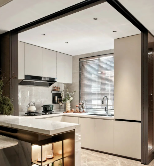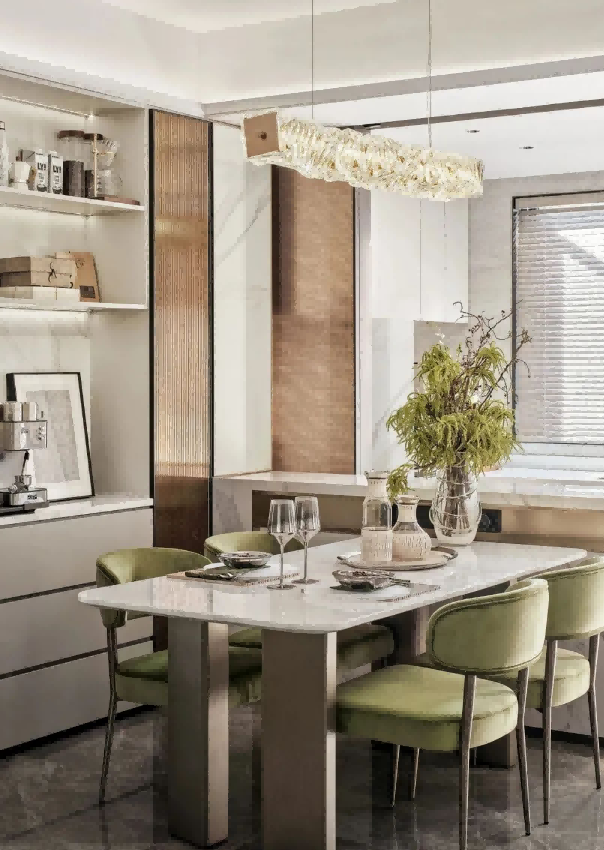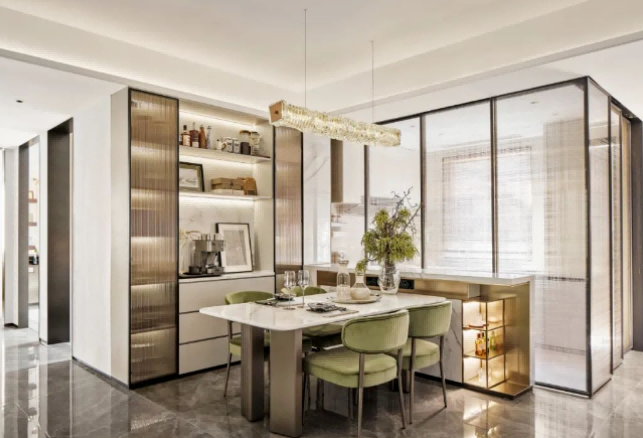 利用空间环境优势,保留大量采光,保持开阔的空间视野,通透推拉门设计,让餐厅亦可成为客厅的一角也可是厨房的延展。