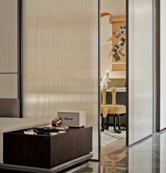 在横向上串联玄关、厨房、餐厅、客厅与阳台的开放式空间,在纵轴上从客厅延伸长廊贯穿三间卧室,并且利用推拉活动门,合则独立、开则打破空间界定,展现出绝妙设计,破解空间限制。
