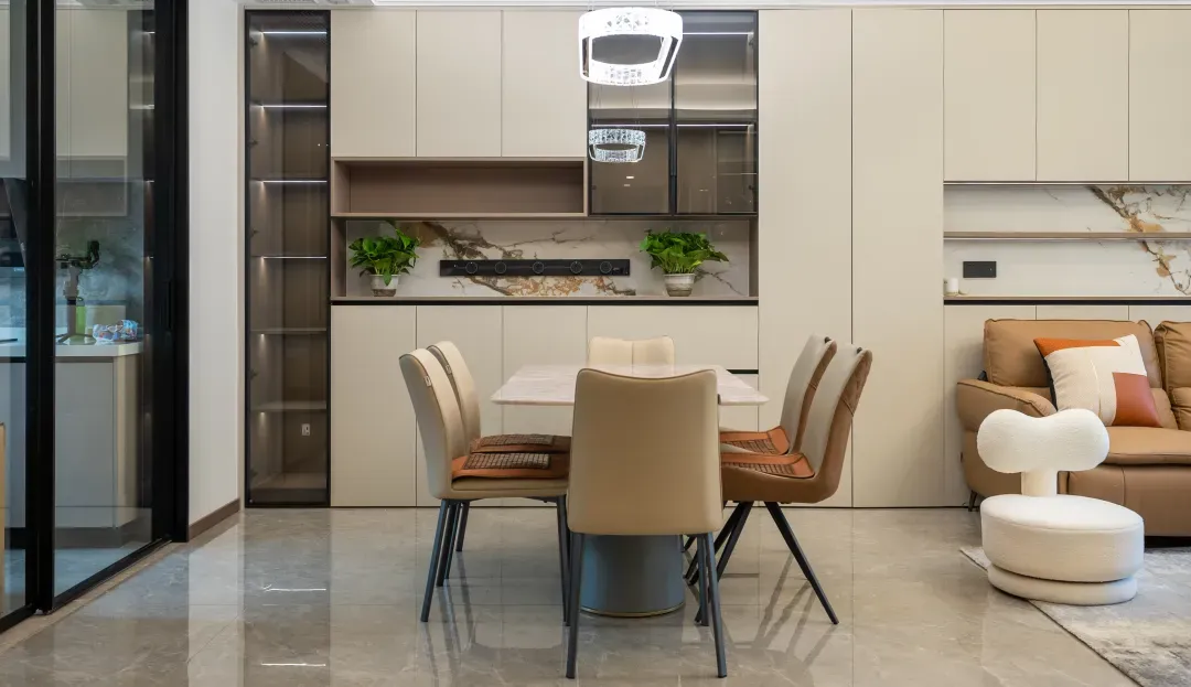 旁边的餐边柜设计十分贴心,开放式的格子可以摆放精致的餐具或绿植, 顶天立地的柜体则能收纳各种杂物,让餐厅始终保持整洁。
