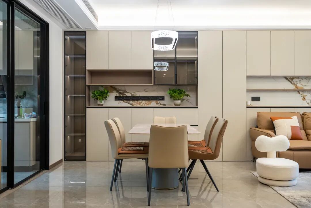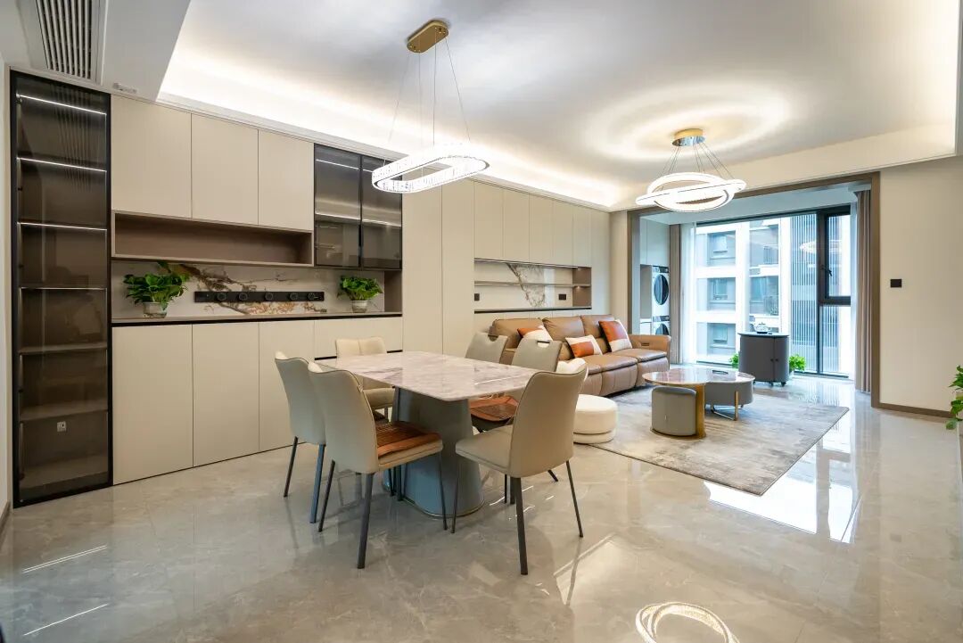 从客厅往内走,便是餐厨区域,这里是烟火气与仪式感的融合之地。餐厅里,长方形的大理石餐桌质感高级,搭配同色系的餐椅,简约又大气。
