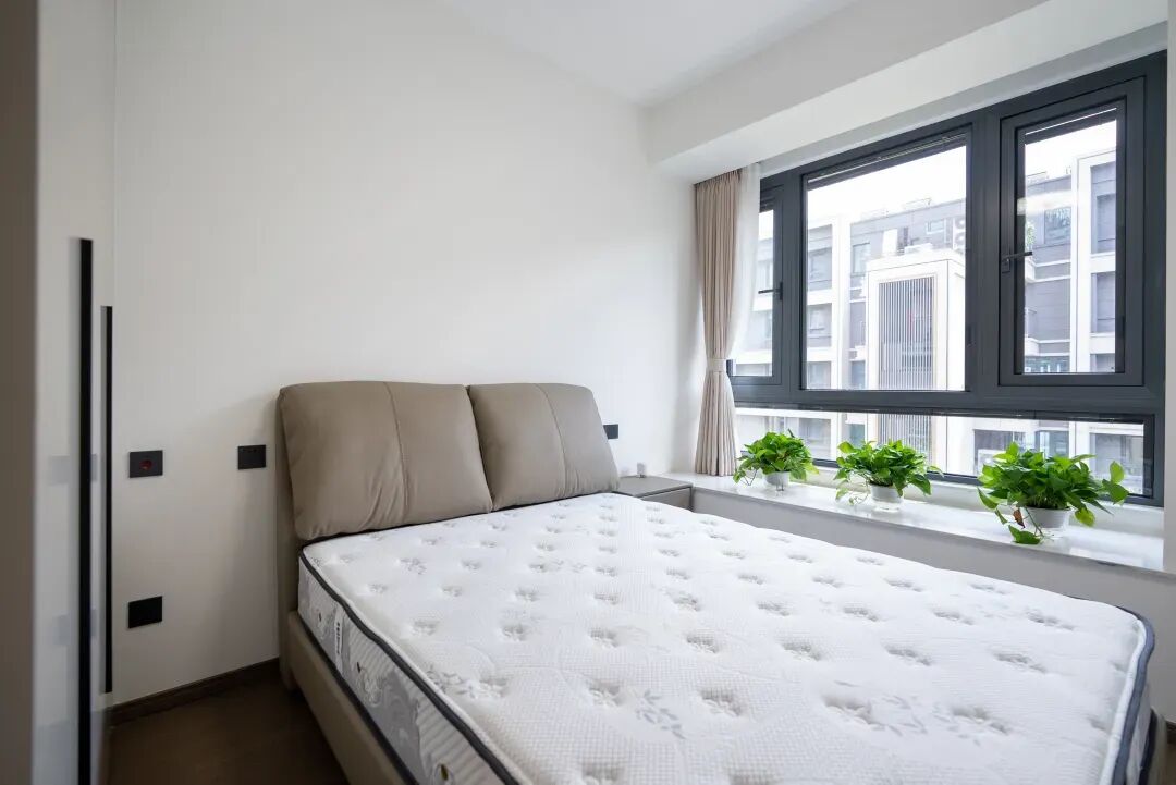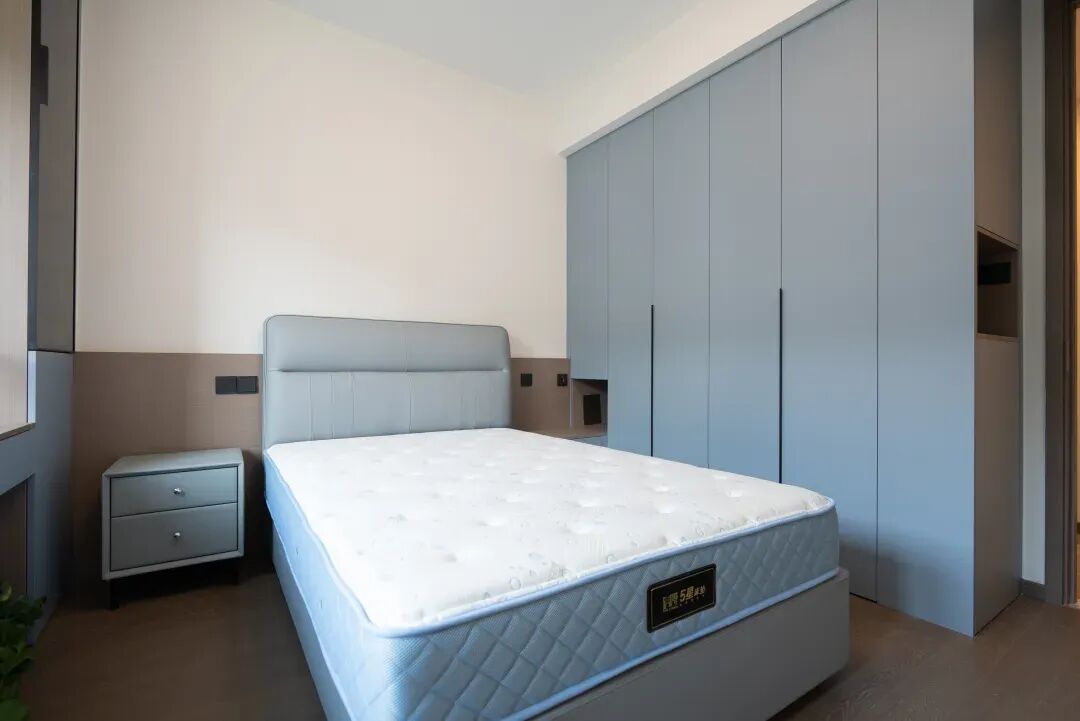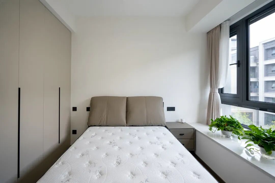 次卧则更显清新雅致,浅灰色的床头靠背,搭配简洁的床品,给人一种宁静的感觉。