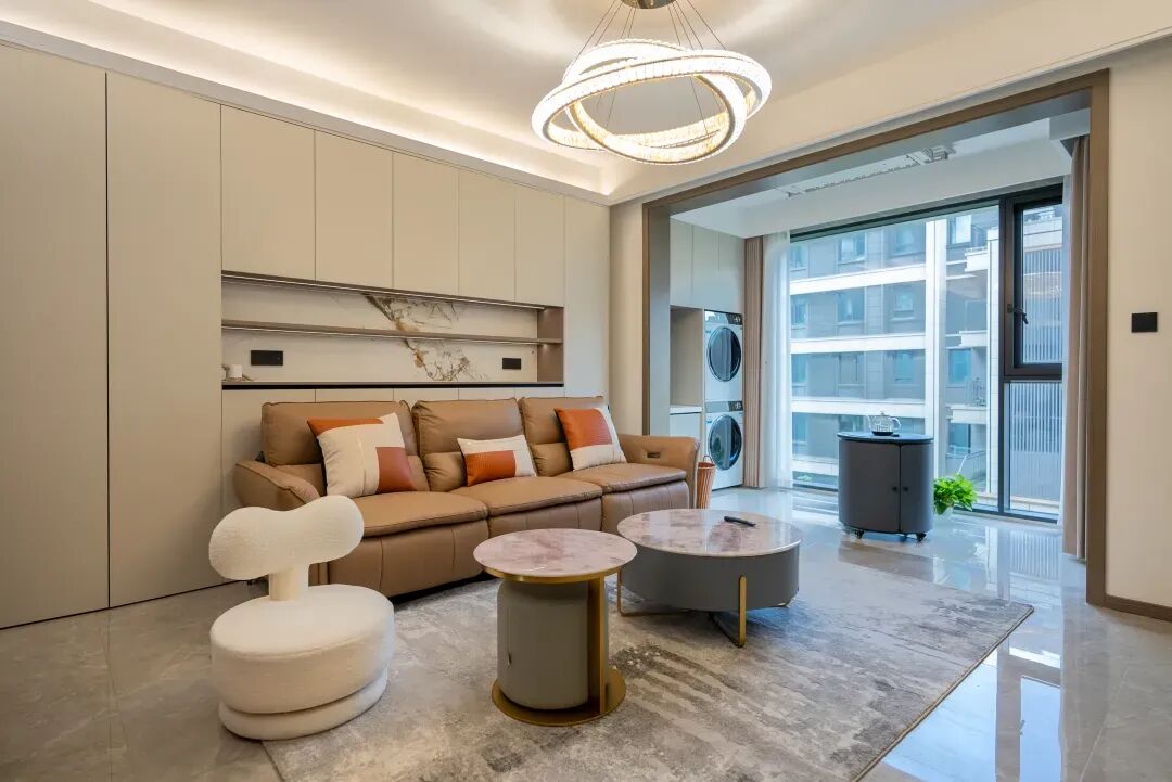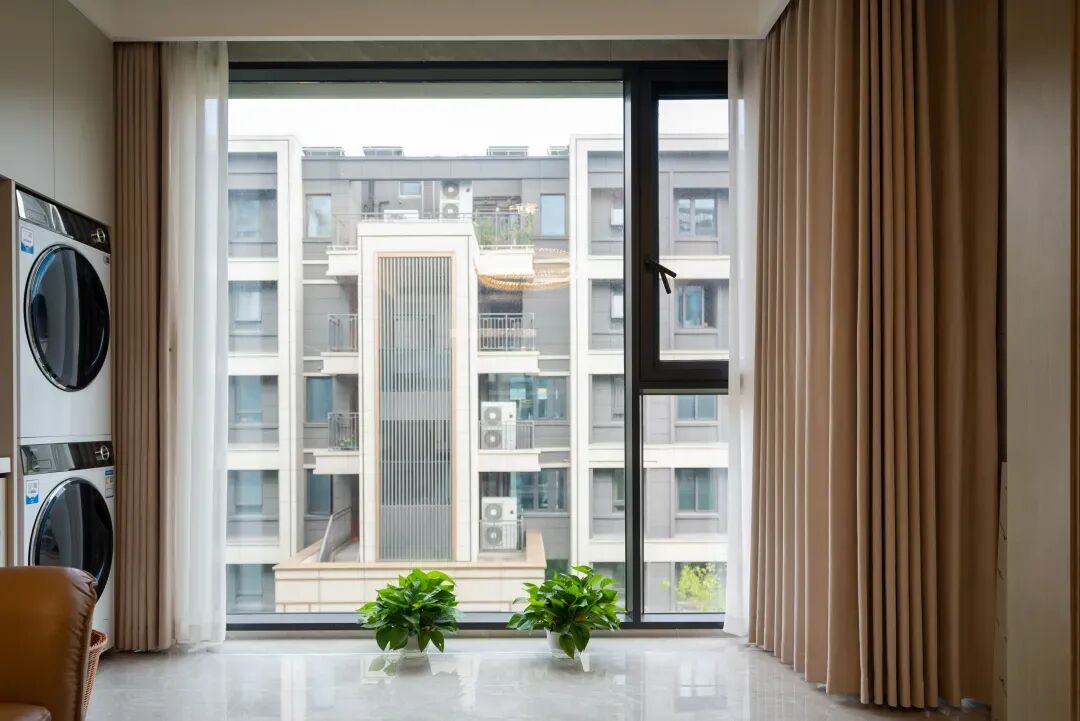 阳台纳入功能区,洗烘一体机有了去处。超大的落地窗更是将室外的光线尽情引入,晴天时,阳光透过玻璃洒在地板上,形成斑驳的光影,坐在沙发上,便能享受一场免费的“日光浴”。