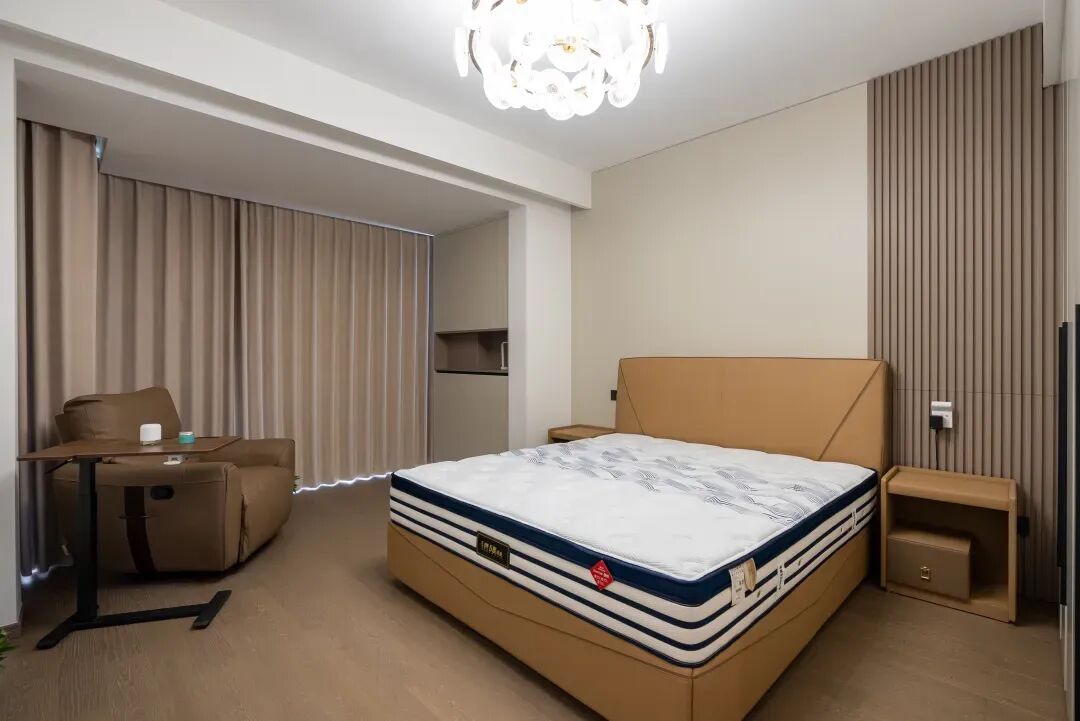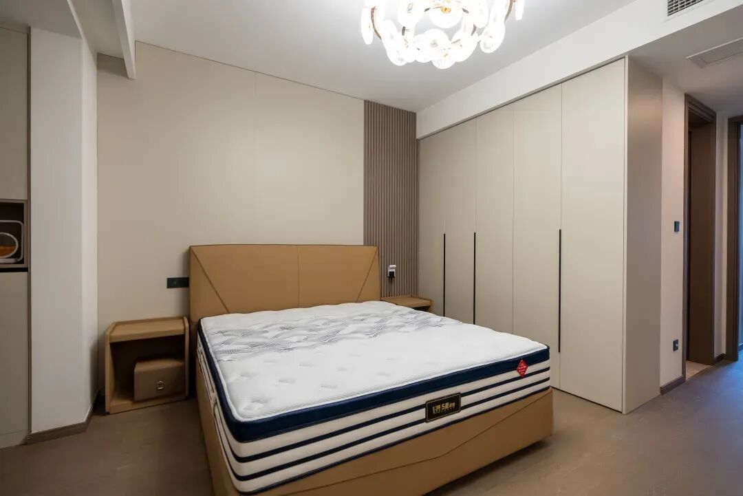 主卧的色调温暖柔和,棕色的床头靠背与客厅沙发相呼应,营造出统一的温馨氛围。一张舒适的大床,是卸下疲惫、进入甜美梦乡的载体。