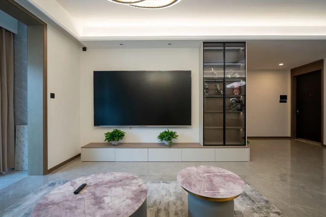 沙发背景墙做通顶定制柜,增加客厅收纳空间。天花板上,环形的水晶吊灯散发着柔和的光芒,与周围的灯带相互映衬,让整个客厅温馨又明亮。