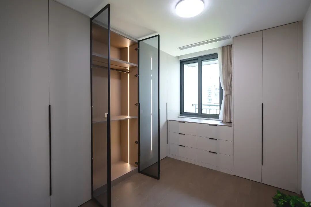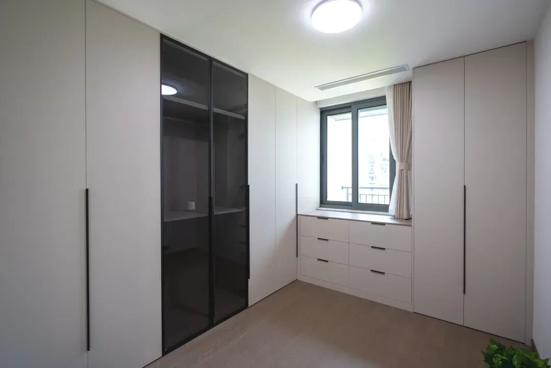 不到120平的房子,除了拥有3个独立卧室之外,设计师还为屋主设计了一个独立的衣帽间!衣帽间不到4个平方,2面墙都做满定制柜!这收纳能力真的不服不行?