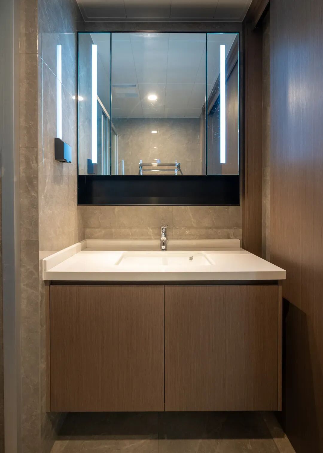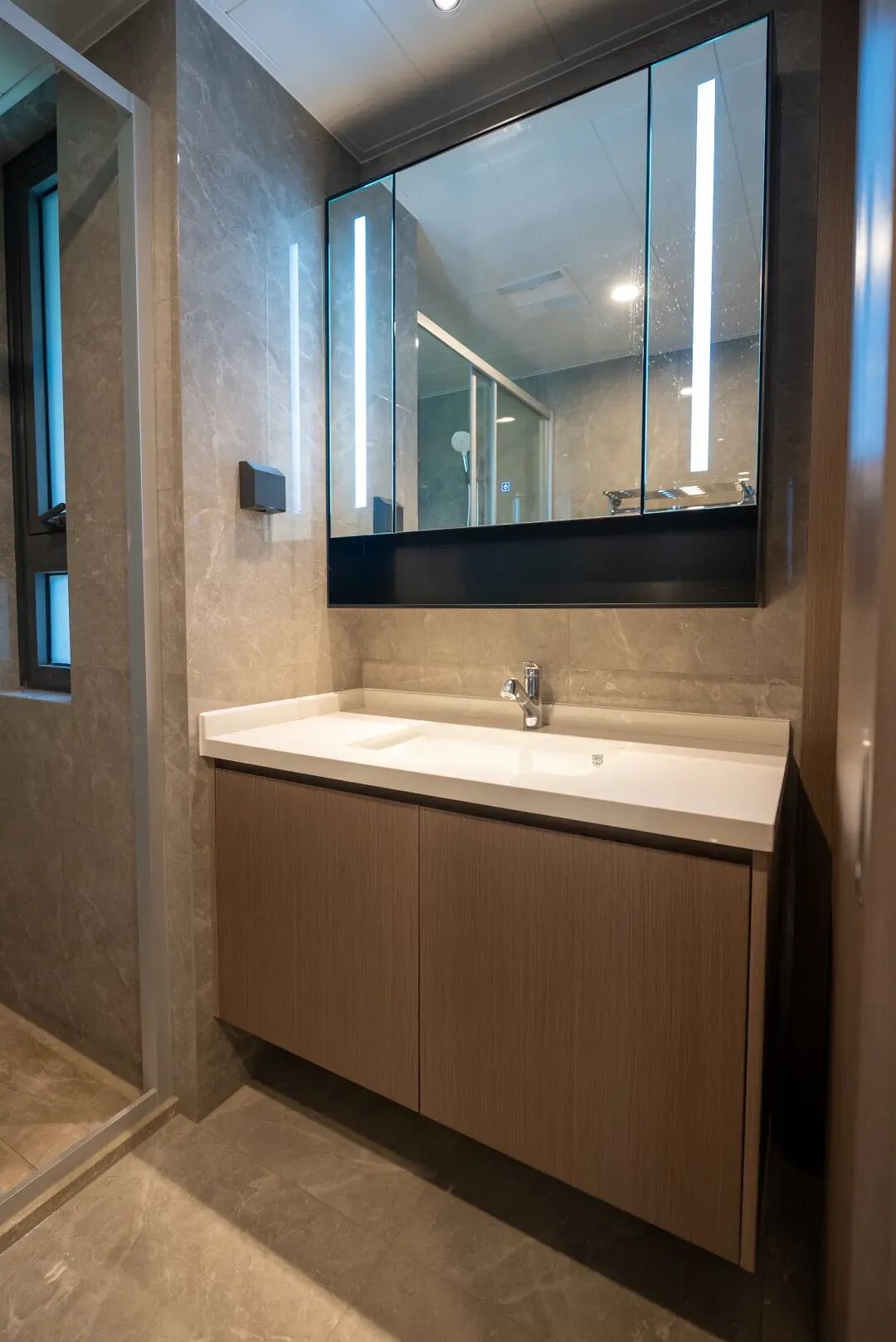 卫浴间的设计同样用心,灰色的大理石瓷砖,营造出一种沉稳大气的氛围。智能镜柜不仅具有强大的收纳功能,还自带灯光,方便日常洗漱、整理仪容。