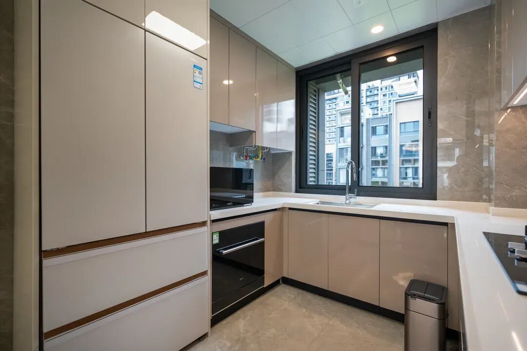 浅色系的橱柜与白色的台面相互搭配,干净又清爽。嵌入式的家电让厨房整体感更强,同时也节省了空间。