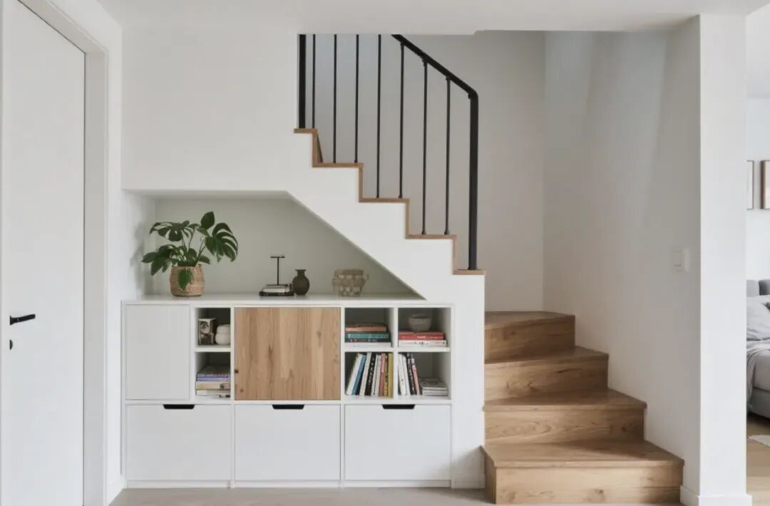 但全屋定制可以根据家里的每一处角落来设计,像楼梯下方、转角处这些 “鸡肋” 空间,都能被巧妙利用起来。比如在楼梯下方打造收纳柜,在转角处设计旋转书架,空间利用率瞬间提升。